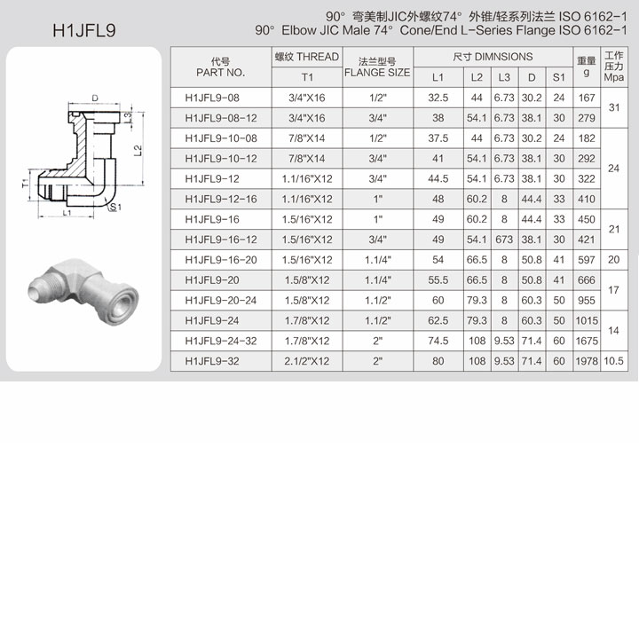 90°弯美制JIC外螺纹74°外锥/轻系列法兰 ISO 6162-1